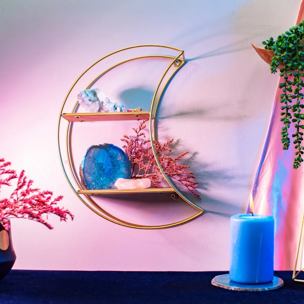 Your Celestial dreams have come true! Create midnight magic in your home and reach for the moon with this galaxy gold shelf. Featuring a minimalistic luna shape and two platforms to display your favourite pieces, this decor shelf also has two handy hook holes.