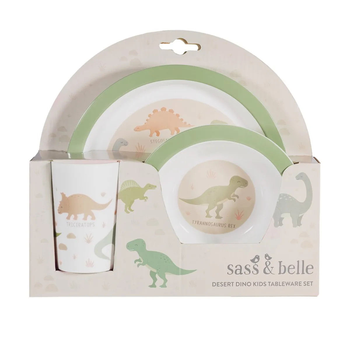 The Desert Dino Kids Tableware Set is perfect for adding some fun to meal time. The set includes a plate, bowl and cup, each featuring a playful desert dino design.